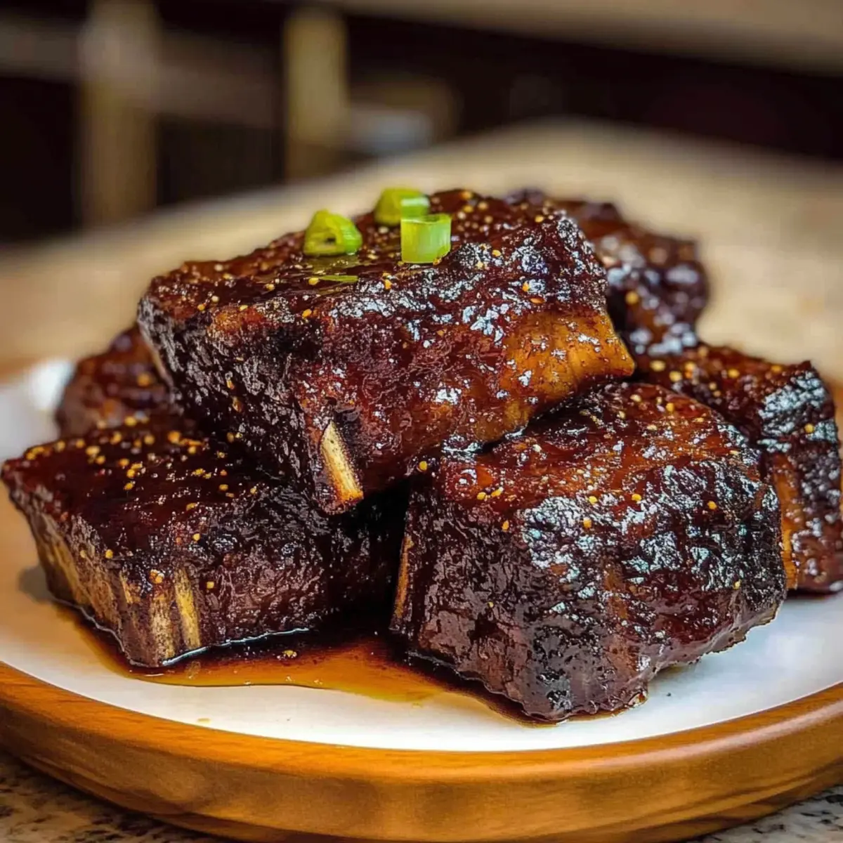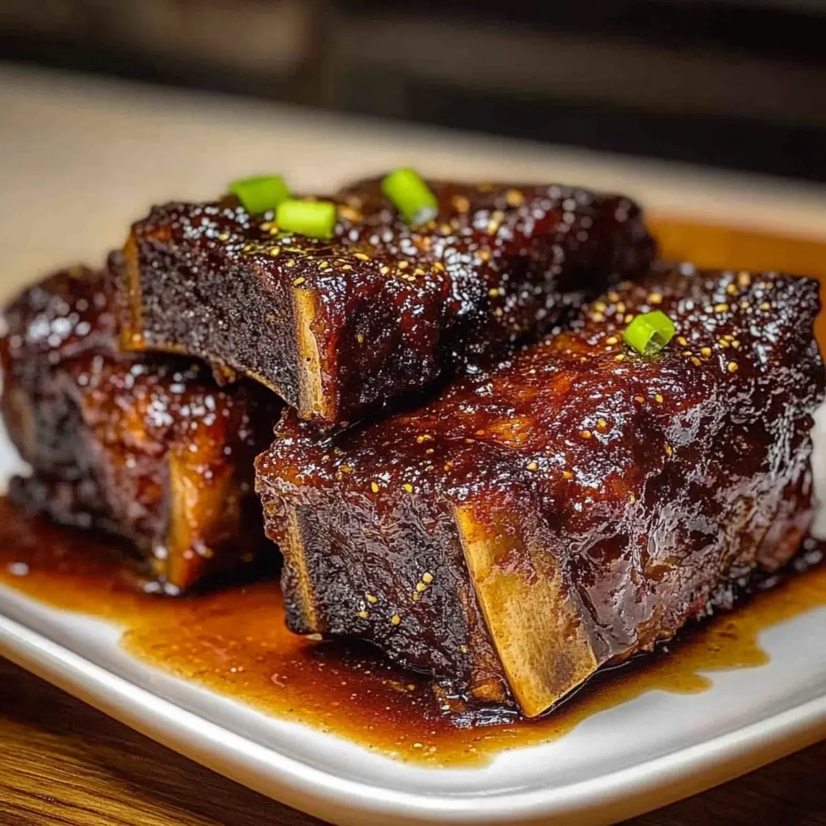 Plate the tender Asian beef short ribs over a bed of steamed rice, noodles, or roasted vegetables. Drizzle the reduced glaze generously over the ribs, ensuring each piece is well-coated. Garnish with sliced green onions for a pop of freshness and color, making this Asian beef short rib dish an impressive centerpiece for your meal.