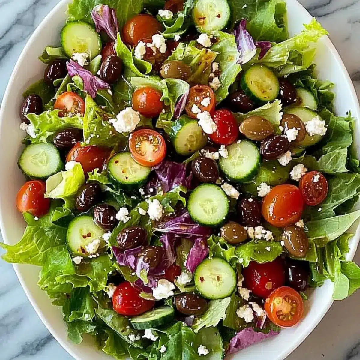 To enhance visual appeal, transfer the beautifully tossed Best Simple Side Salad to a large, flat serving platter or bowl. This allows the colorful ingredients to be showcased effectively. Garnish with a sprinkle of additional feta or a few extra olives if you wish—it’s not just a dish, it’s a feast for the eyes!