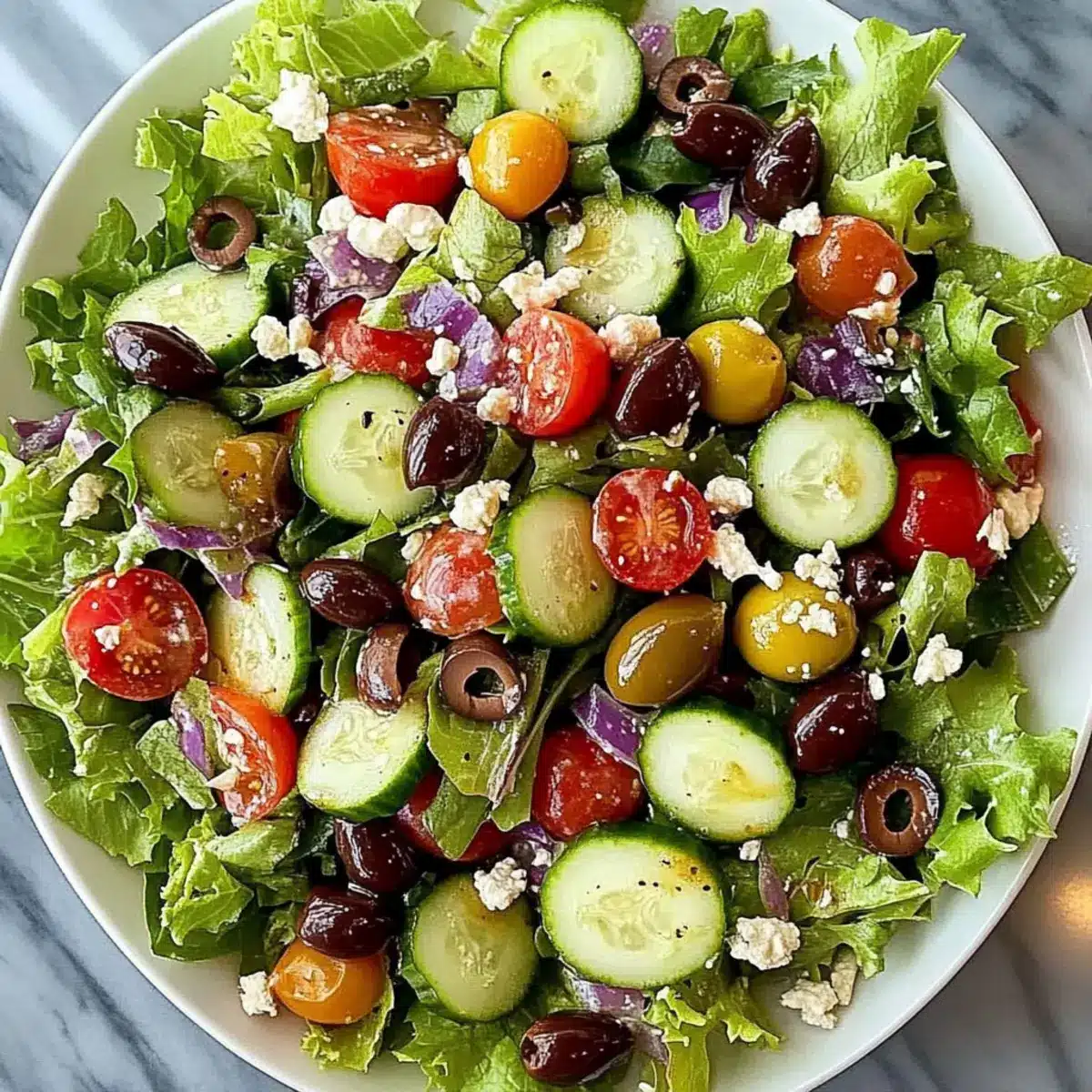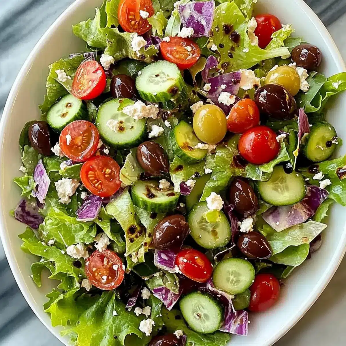 - In a large mixing bowl, combine the lettuce, cucumber, tomatoes, onion, olives, and feta. Toss gently.