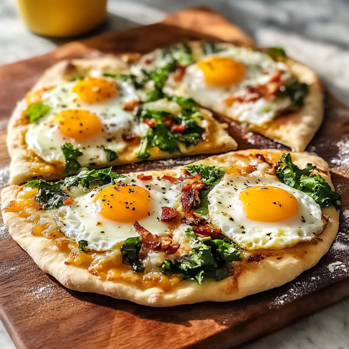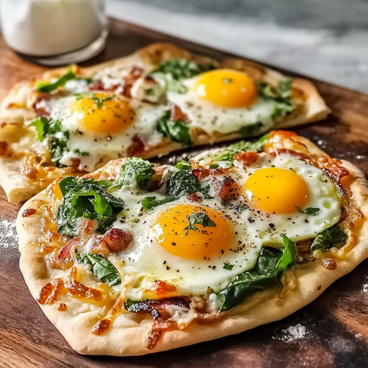 Getting your Breakfast Flatbread ready in advance is a fantastic way to save time on busy mornings! You can prep the flatbreads topped with cheese, greens, and cooked bacon up to 24 hours before baking. Simply assemble them on a baking sheet, cover tightly with plastic wrap, and refrigerate. This helps maintain freshness while allowing the flavors to meld together. When you’re ready to enjoy your breakfast, crack the eggs directly onto the prepped flatbreads and bake as instructed until the edges are golden and the yolks are perfectly runny. With just a few minutes in the oven, you’ll have a delicious, homemade breakfast ready in no time!