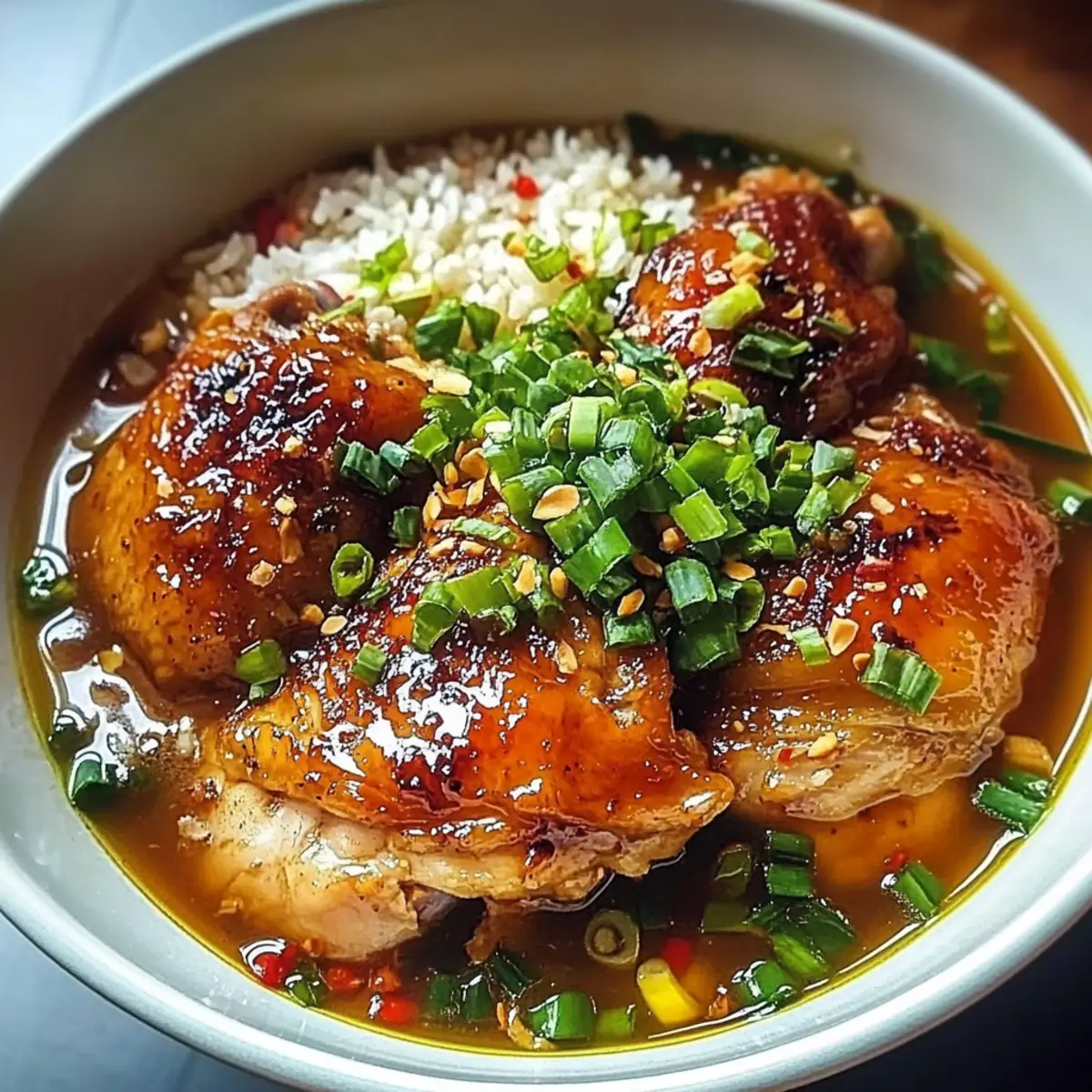Once the chicken is cooked, carefully place a serving of jasmine rice in a bowl. Use a slotted spoon to top the rice with the caramelised chicken and ladle the rich garlic ginger broth over the top. Garnish with freshly sliced spring onions for added freshness and a crunchy contrast. Your Caramelised Soy Chicken in Garlic Ginger Broth with Rice is now ready to be enjoyed!