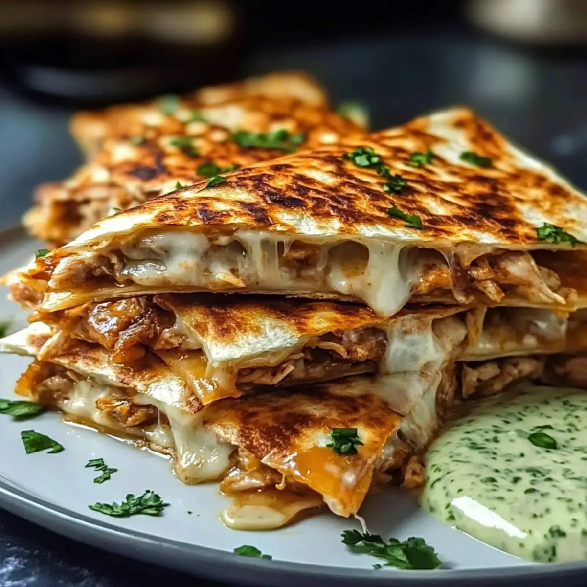 Once golden and crispy, remove the quesadillas from the skillet and let them rest for a minute. Use a sharp knife or pizza cutter to slice each quesadilla into wedges. Serve hot with the prepared jalapeño cream sauce on the side, garnished with freshly chopped cilantro to elevate the presentation and flavor of your Cheesy Hot Honey Chicken Quesadillas.