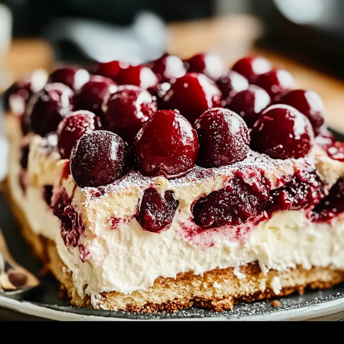 - Assemble the Tiramisu: Dip ladyfingers in the espresso mixture for 1-2 seconds per side. In an 8x8 inch dish, layer dipped ladyfingers, mascarpone cream, and cooled cherry mixture. Repeat layers.