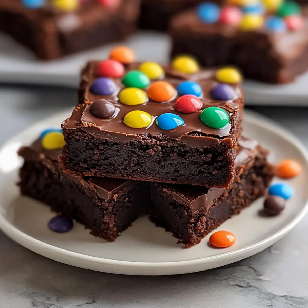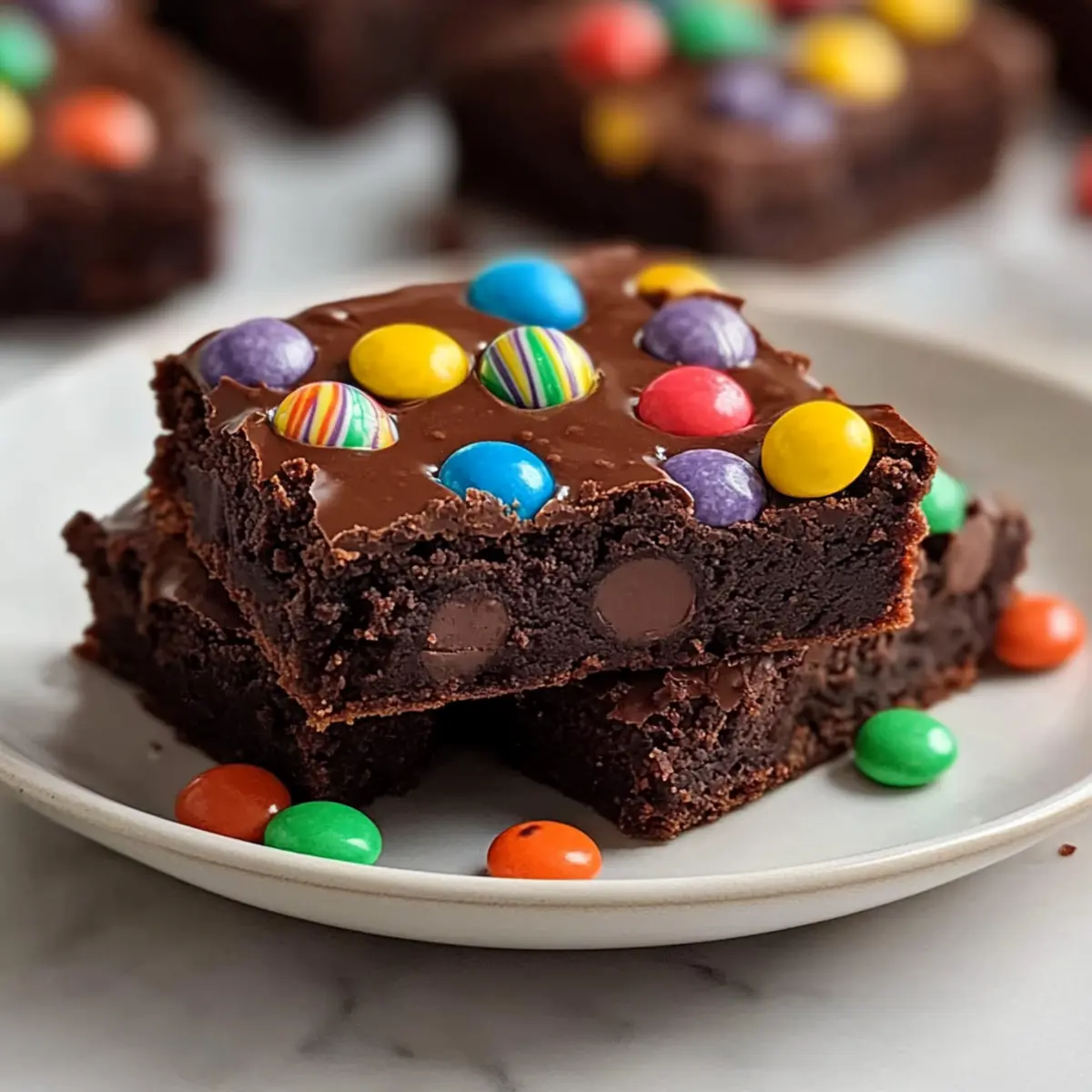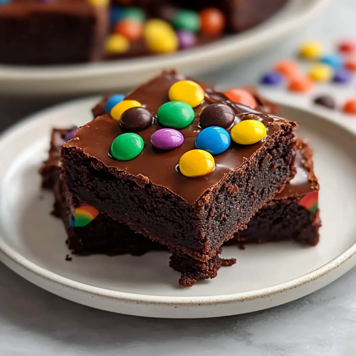Once the brownies have cooled in the pan for about 10 minutes, pour the prepared ganache over the top, spreading it out evenly. While the ganache is still warm, sprinkle a generous amount of rainbow candy-coated chocolate chips over the surface, adding a pop of color and crunch to your Cosmic Brownies.