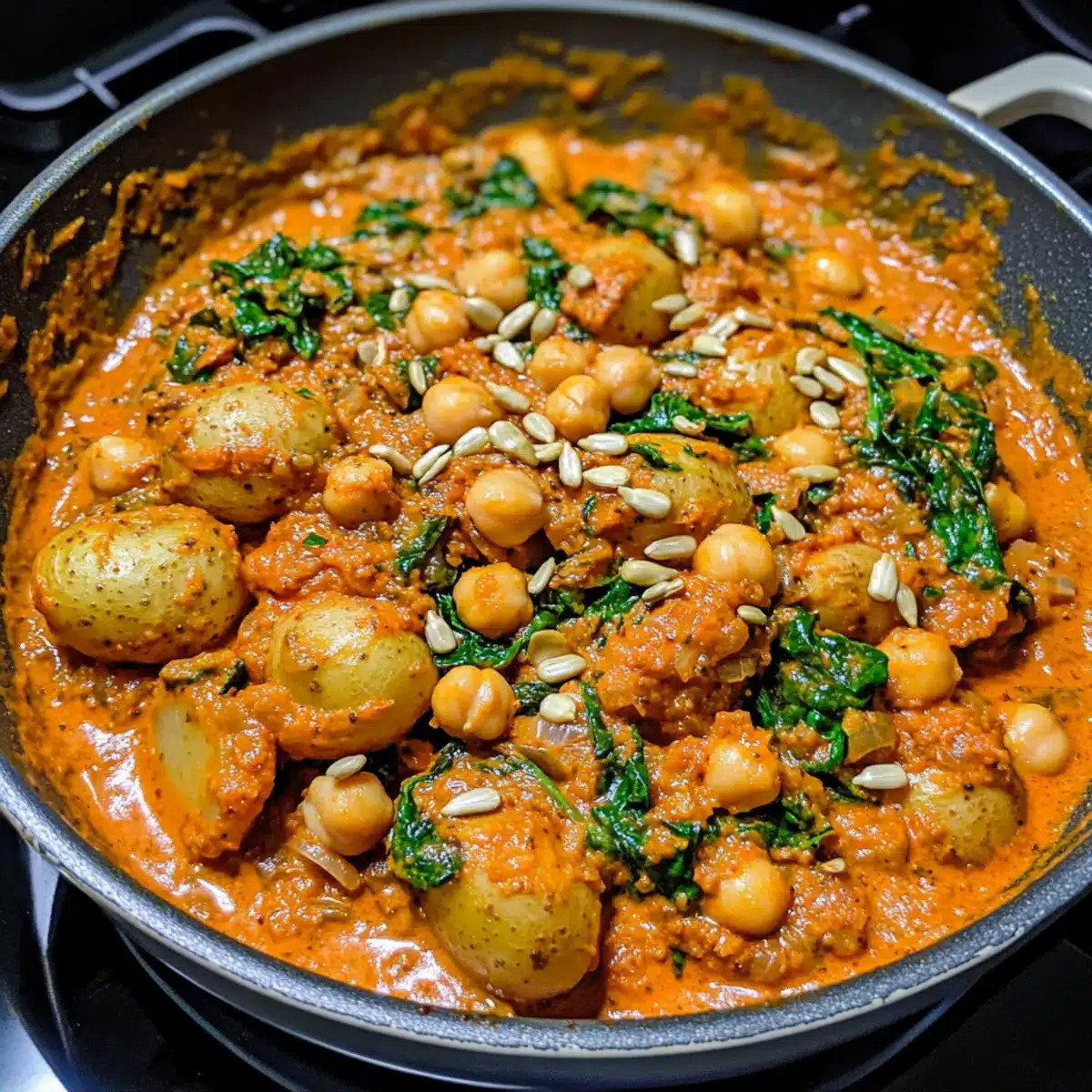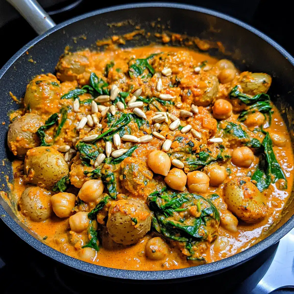Pour in the vegan cream and toss in the chopped spinach, gently stirring until the spinach wilts down into the rich sauce. Allow everything to cook together for another 2-3 minutes on low heat, then taste and adjust seasoning with more salt or pepper as needed. Your Creamy Paprika Potatoes are nearing perfection!