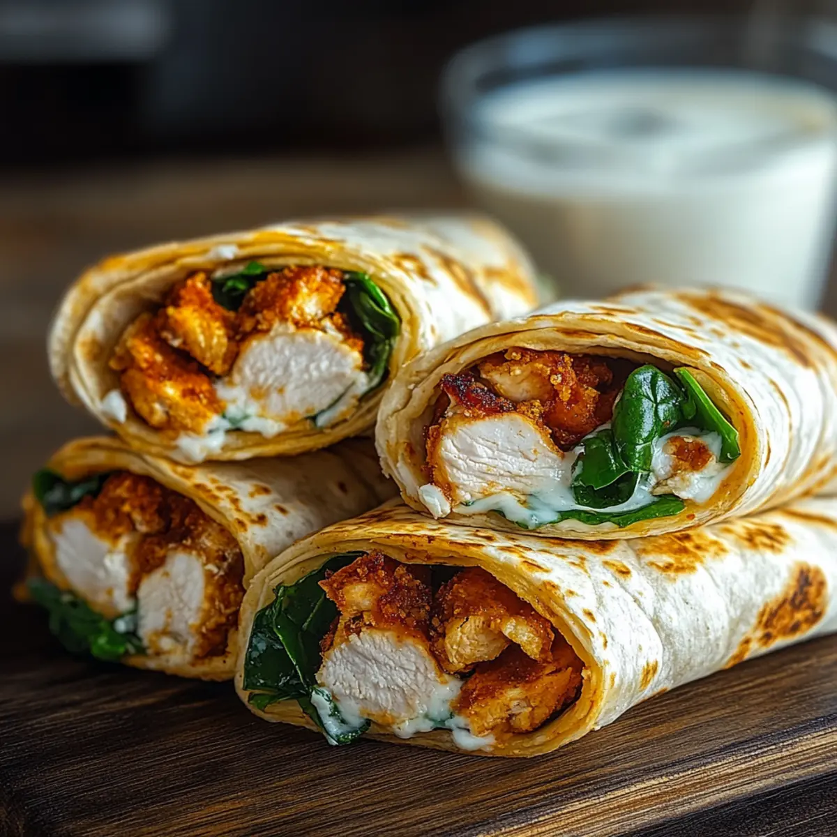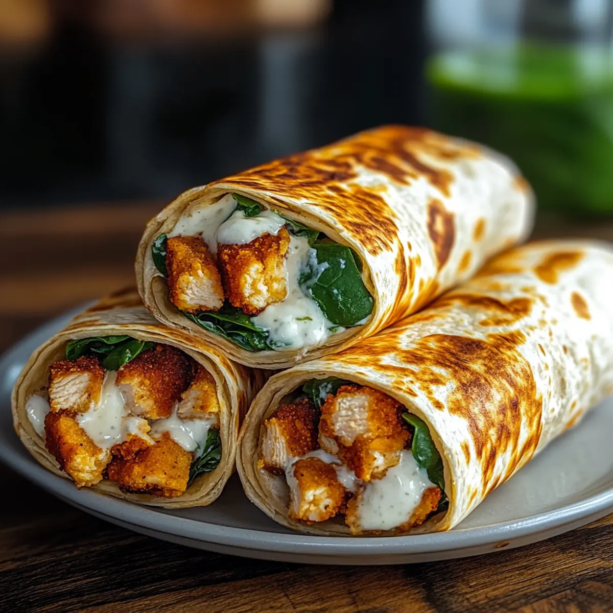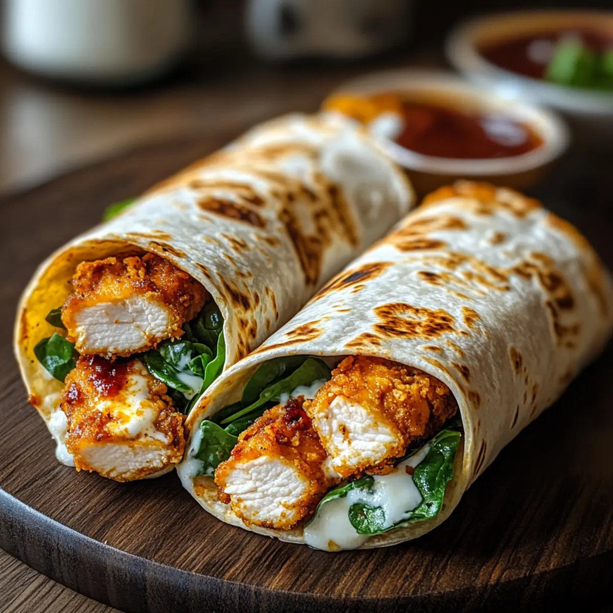 Now that your chicken is cooked, lay out each tortilla flat. Start by layering fresh spinach leaves down the center of each tortilla, followed by a generous sprinkle of shredded mozzarella cheese. Top it with your crispy chicken strips, then roll the tortilla tightly to encase the delicious filling, creating a compact wrap.