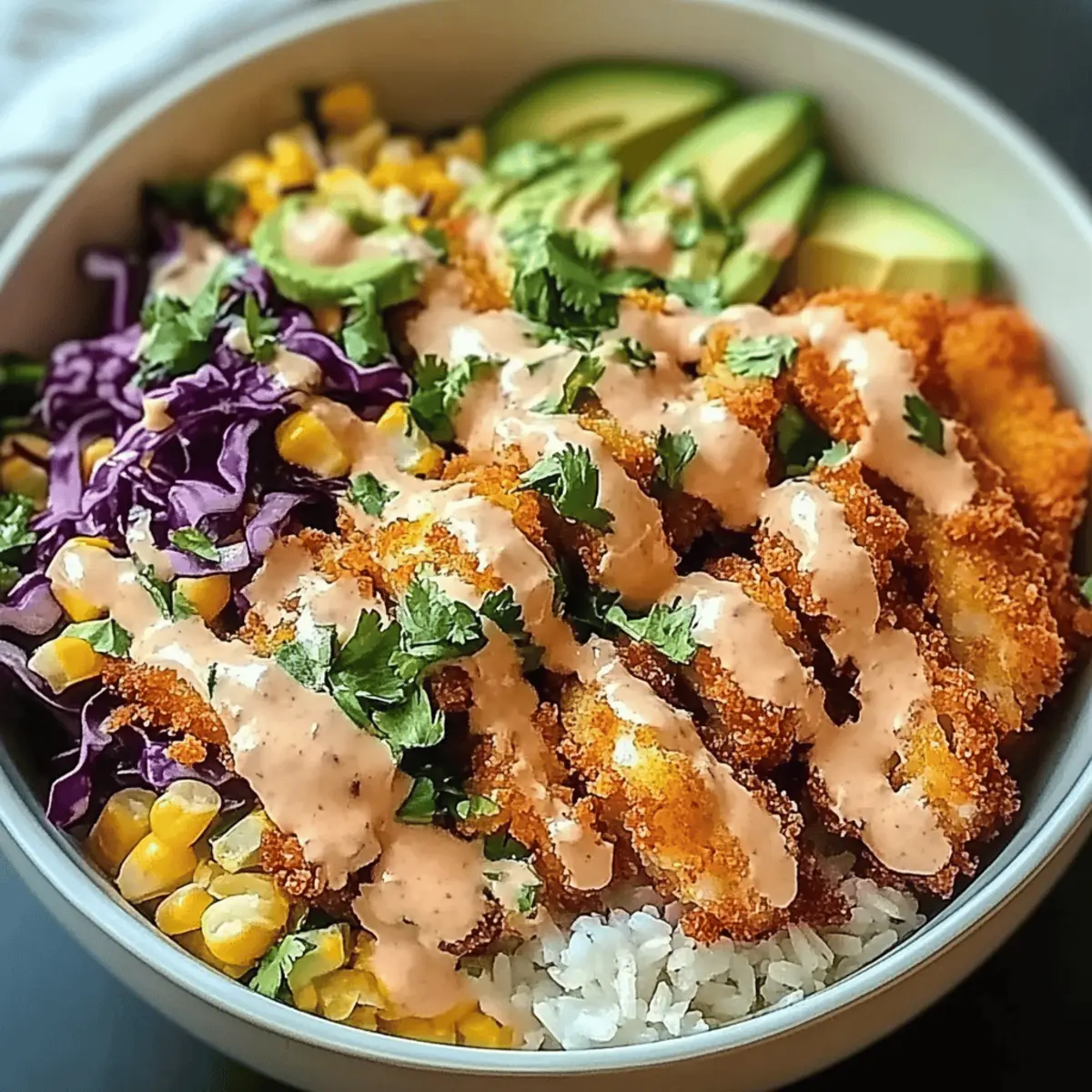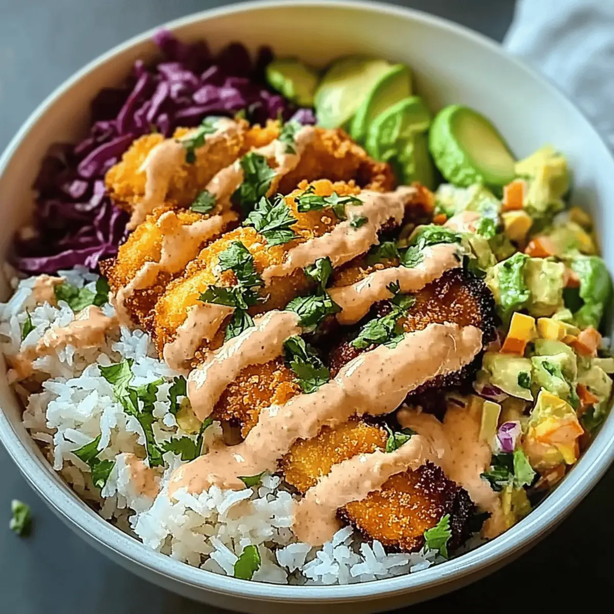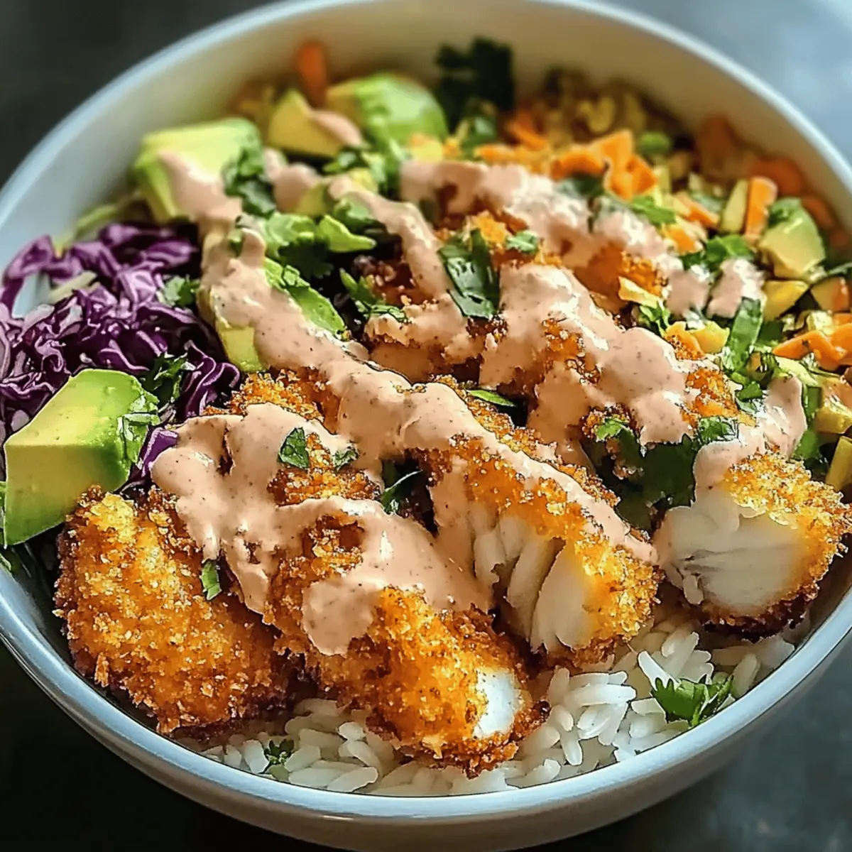 - In each bowl, create a base of rice or quinoa, add crispy fish, zesty slaw, and drizzle with creamy sauce.