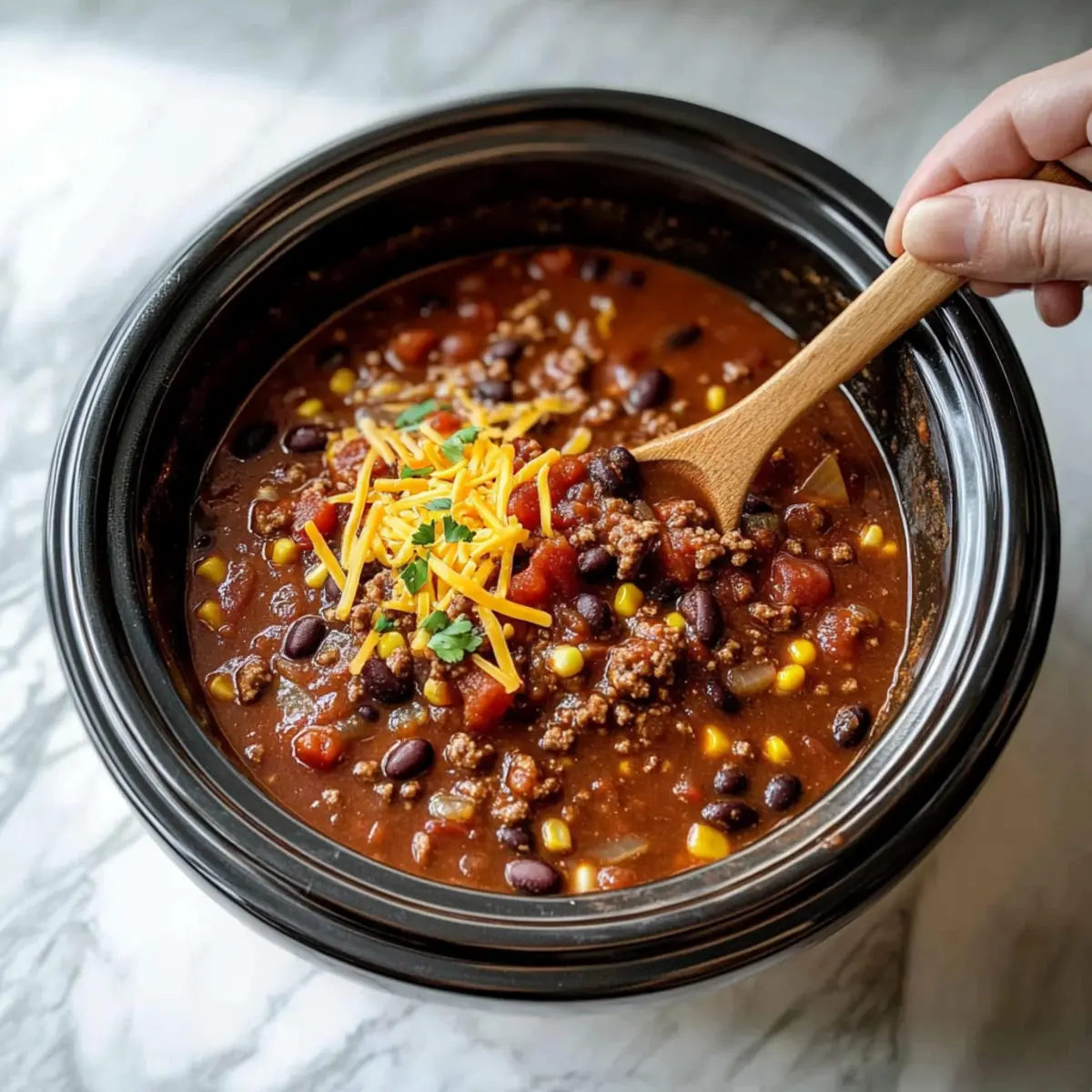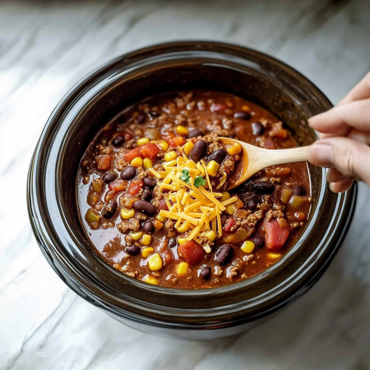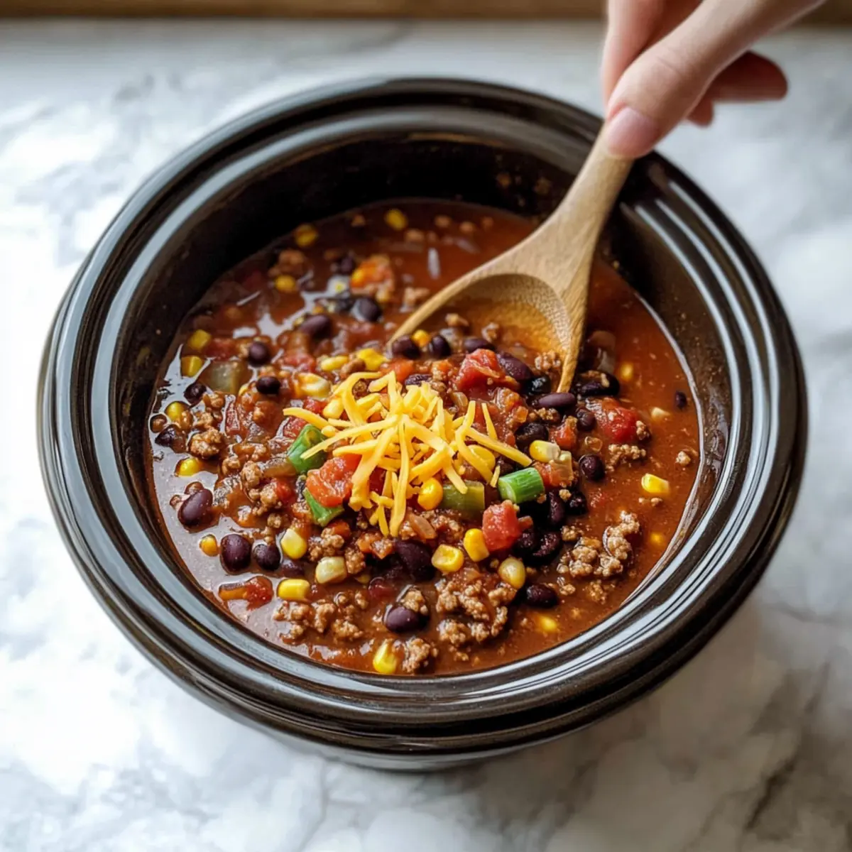 In the Crockpot, combine the browned beef with the canned black beans, corn, diced tomatoes, and tomato paste. Pour in the beef broth, then add your chopped onion and minced garlic. Sprinkle all the spices, such as chili powder and cumin, over the mixture. Stir everything together thoroughly to ensure each ingredient is well incorporated, creating a fragrant blend of flavors.