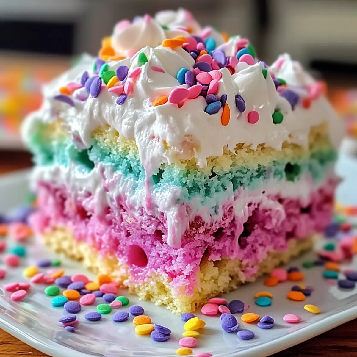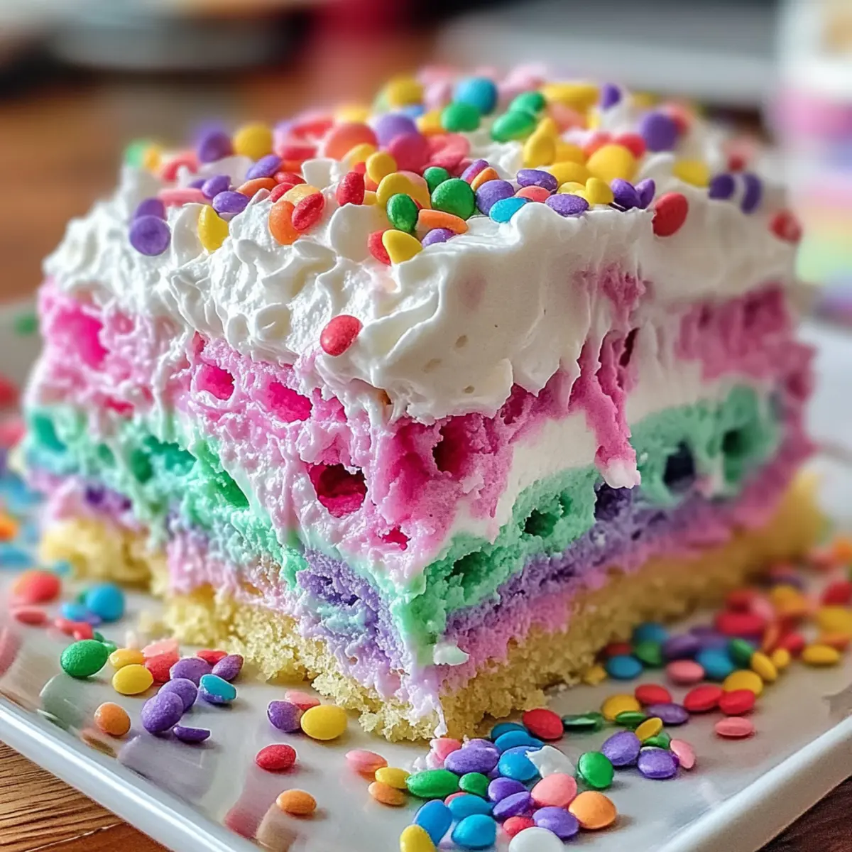 Finish your Easter Poke Cake by decorating it with sprinkles or festive candies to celebrate the holiday. Chill the cake again if desired until serving. When ready, slice into your vibrant creation, revealing the colorful layers and creamy filling, and enjoy a piece of springtime magic with family and friends!