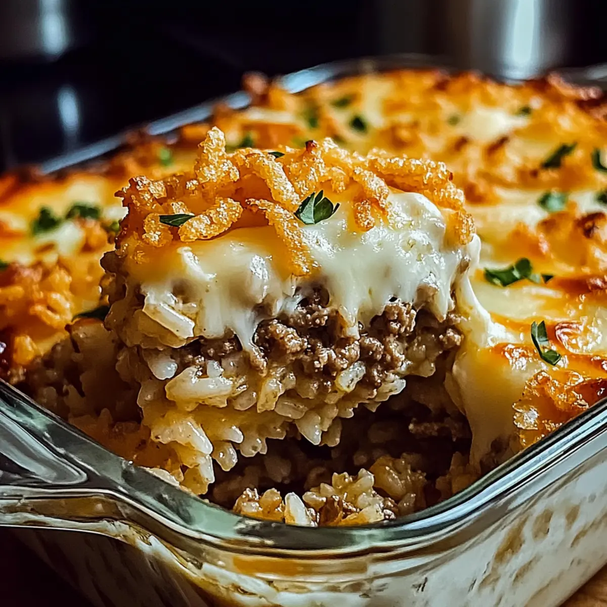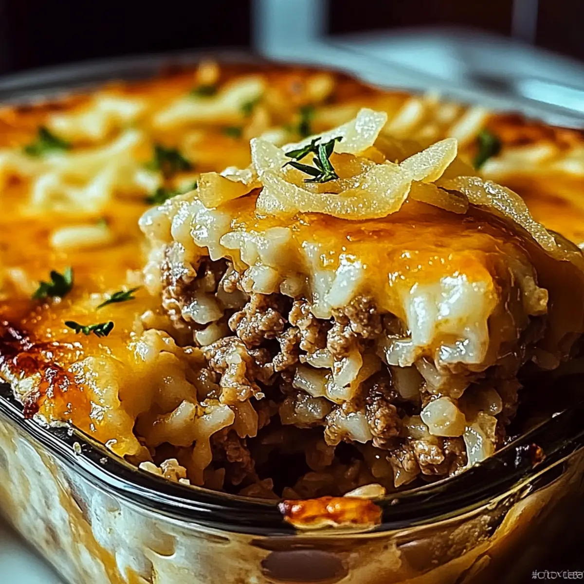 Once the cheese is melted, remove the casserole from the oven and sprinkle the French-fried onions generously over the top. Return it to the oven for another 5 minutes, allowing the onions to crisp up and become golden brown, adding a delightful crunch to your comforting dish.