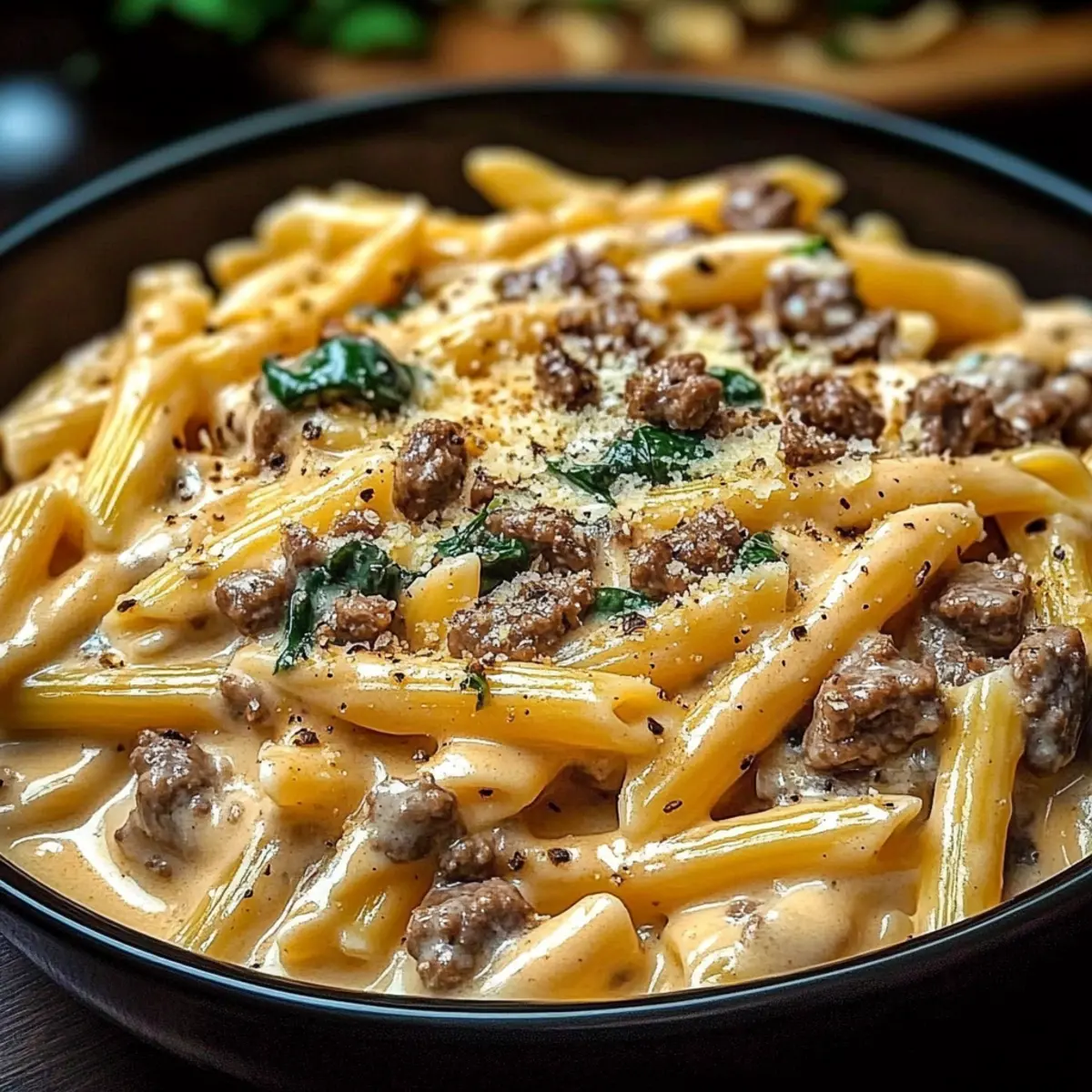 Add the fresh spinach to the creamy beef sauce, gently tossing it into the mixture. Allow the spinach to wilt for about 2-3 minutes, stirring occasionally. This step adds vibrant color and nutrition to the dish, making your High Protein Creamy Beef Pasta not only delicious but visually appealing as well.
