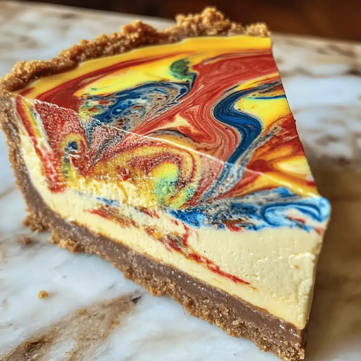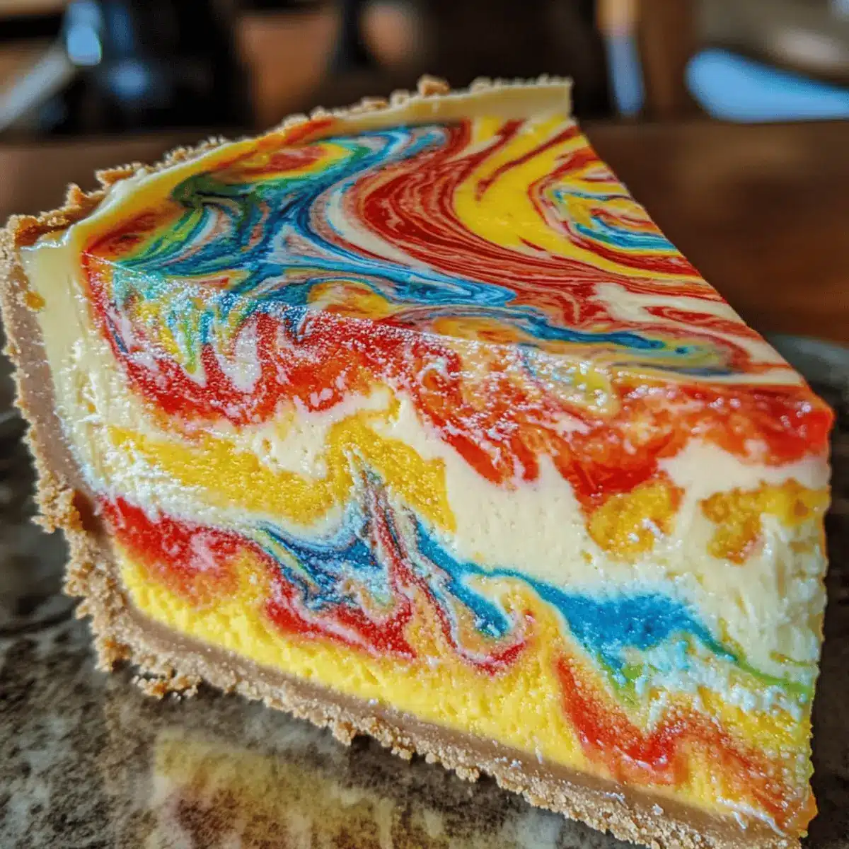 After baking, turn off the oven and crack the door open, allowing the cheesecake to cool gradually for about an hour. Once it’s cooled, transfer the cheesecake to the refrigerator and chill for at least 4 hours, or preferably overnight. Before serving, consider decorating the top with additional swirls of the colored cream and a sprinkle of gold dust to enhance its magical appearance.