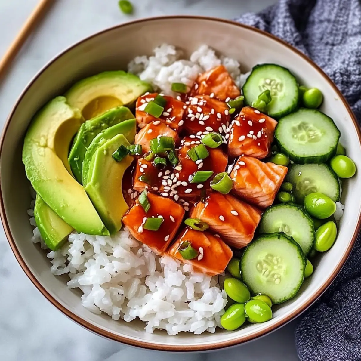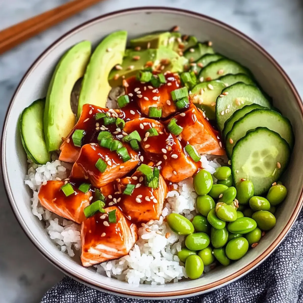 Begin assembling the Honey Sriracha Salmon Bowls by placing a generous scoop of warm rice at the bottom of each bowl. Top the rice with the cooked salmon fillets, then add slices of creamy avocado, crunchy cucumber, and a handful of vibrant edamame. Arrange each ingredient beautifully to create a colorful feast for the eyes.