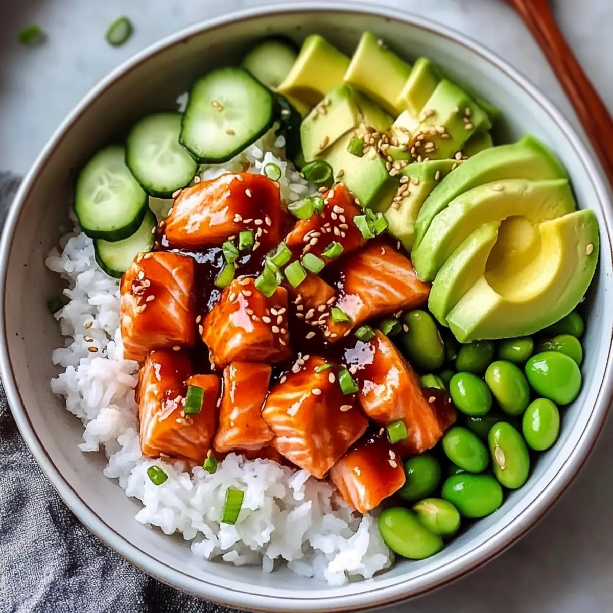 - Assemble the bowls by adding warm rice at the bottom, topped with salmon, slices of avocado, cucumber, and edamame.