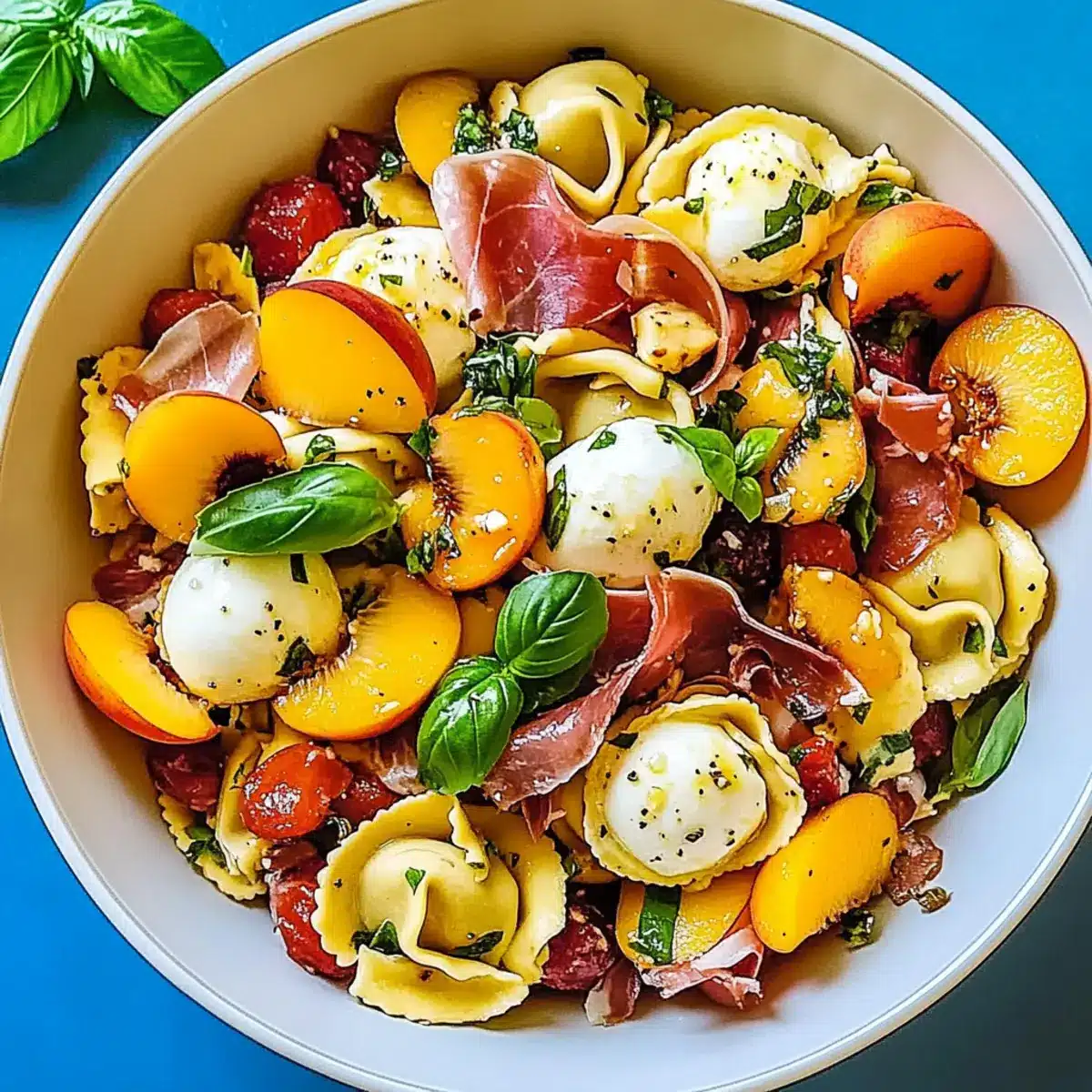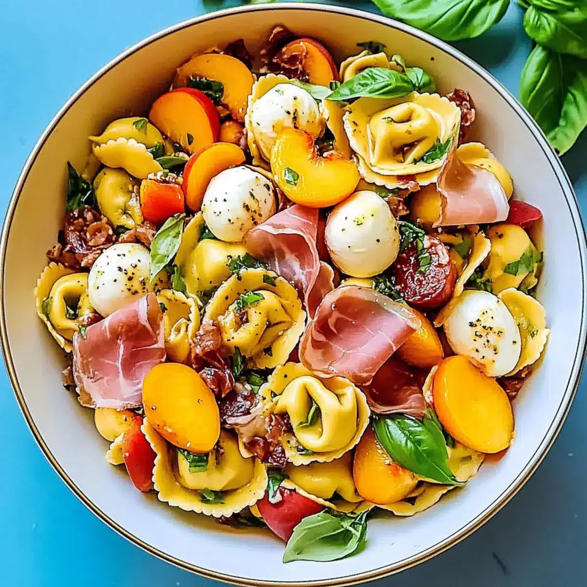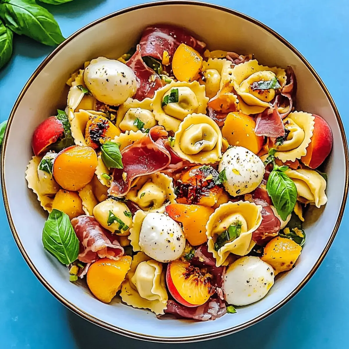 - In a mixing bowl, combine cooled tortellini, diced mozzarella, corn, diced peaches, halved cherry tomatoes, and chopped basil, and toss gently.