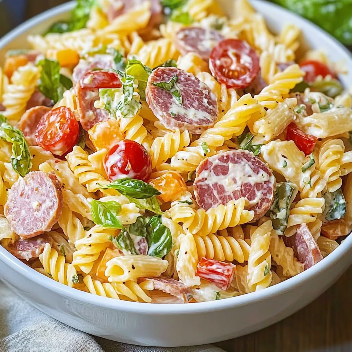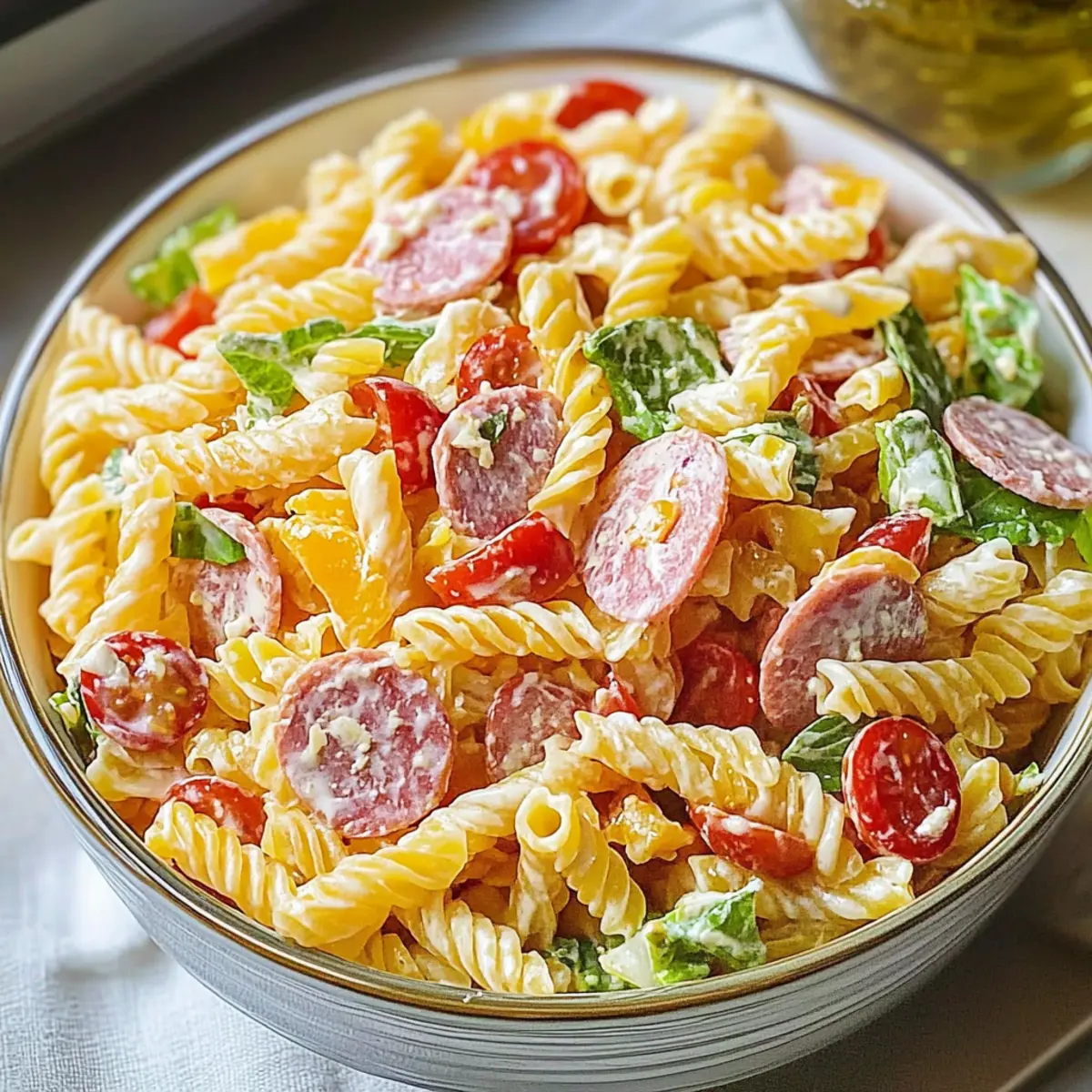 Certainly! If you’re serving this to guests, be aware of common allergies. For instance, please check for sensitivities to gluten since this pasta salad contains wheat-based rotini. Additionally, you can make this salad vegetarian by omitting the deli meats and using plant-based alternatives. If you’re looking for healthier options, light mayonnaise or Greek yogurt can be great substitutes.