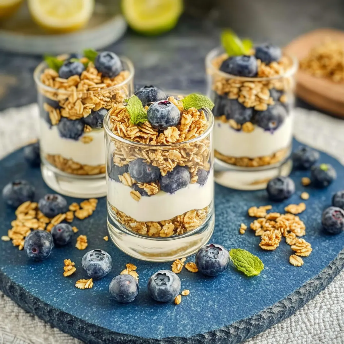 Layering Technique: Alternate layers carefully to showcase vibrant colors and textures. Use a spoon to create clean layers between yogurt, granola, and blueberries.