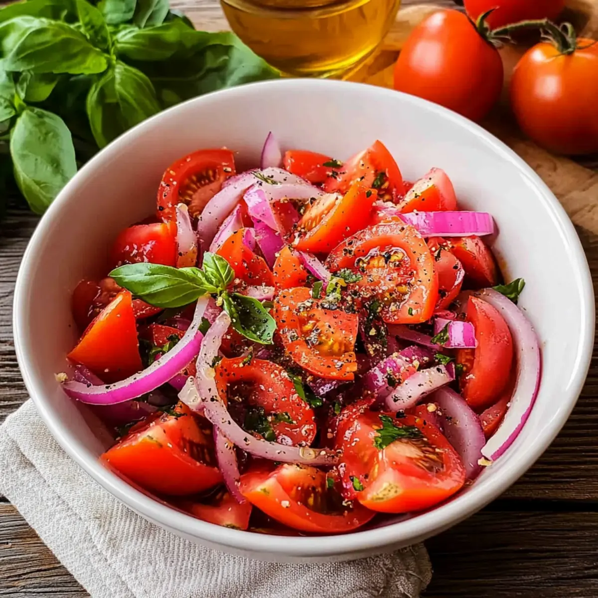 Making your Marinated Tomato Onion Salad ahead of time is a fantastic way to save precious minutes on busy days! You can prep the salad up to 24 hours in advance by chopping the tomatoes and slicing the onions, then mixing them with the marinade. However, to maintain the vegetables’ freshness and avoid excessive softening, it’s best to store the salad in the refrigerator for no more than 2 days. Just cover the bowl or transfer it to an airtight container to keep the flavors intact. When you’re ready to serve, give it a gentle toss and garnish with fresh basil and pepper for that irresistible touch. This preparation ensures you can enjoy delightful, restaurant-quality results with minimal effort, leaving you more time to savor your summer moments!