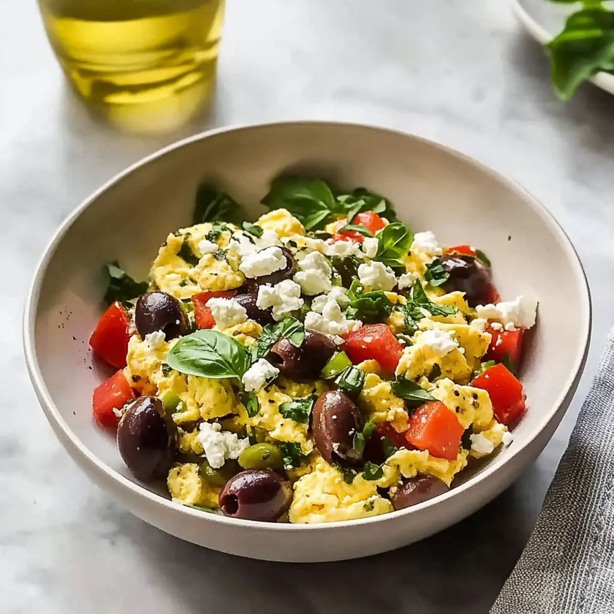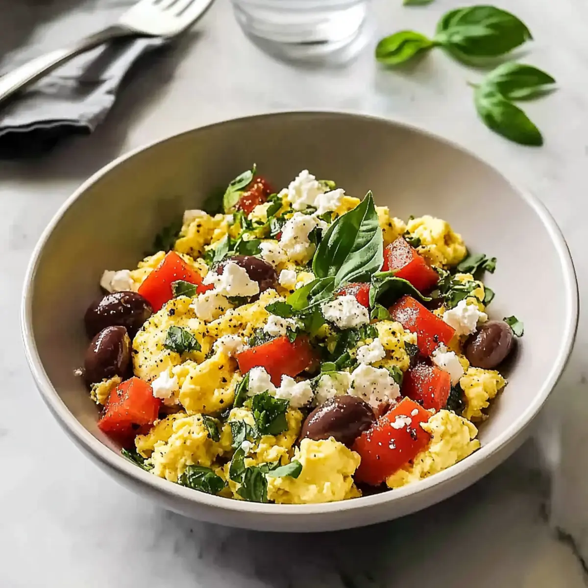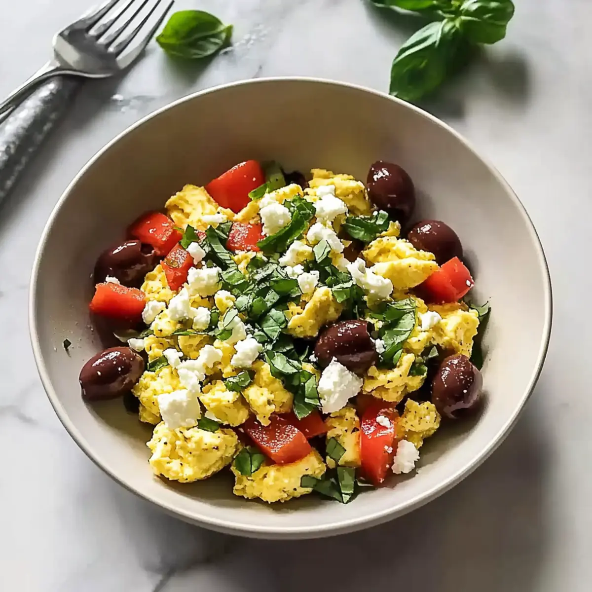 Transfer the creamy scrambled eggs to a bowl, and top with freshly chopped basil to enhance the aroma and add an herbal note. Feel free to include warm pita or a refreshing side salad for a complete meal experience. Your delicious Mediterranean Breakfast Bowl is now ready to enjoy, offering a vibrant start to your day!