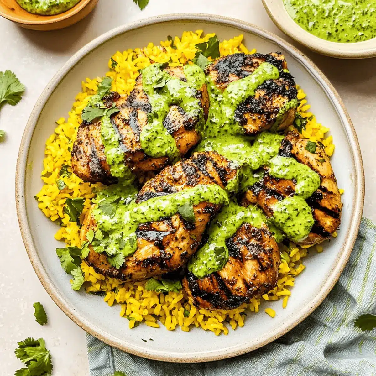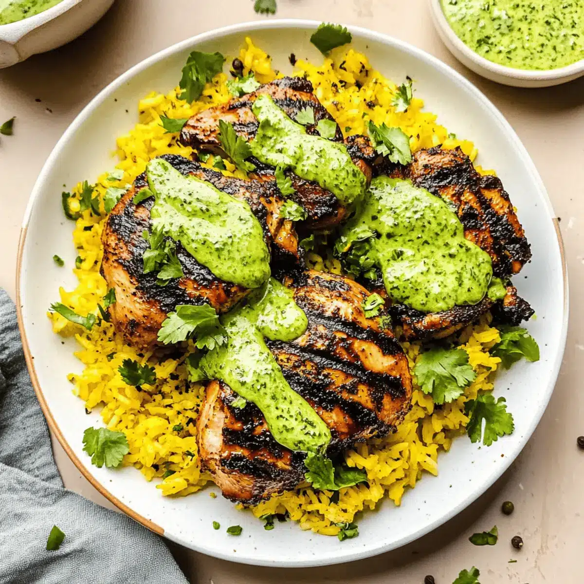 - Serve the Dish: Spoon fluffy rice onto plates, lay grilled or baked chicken on top, and drizzle the creamy green sauce generously.