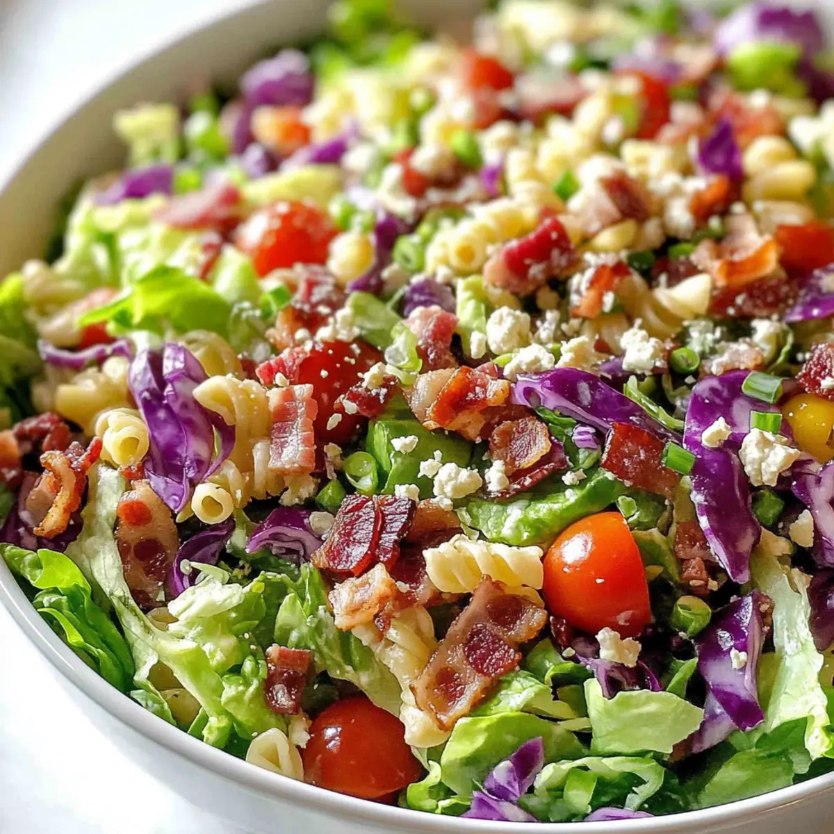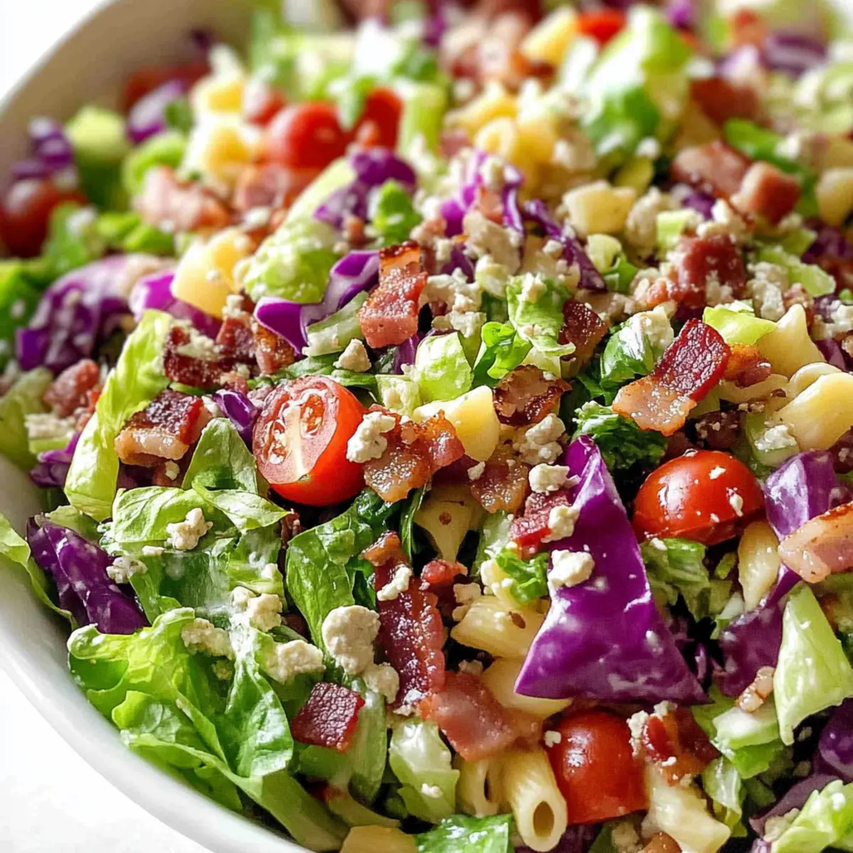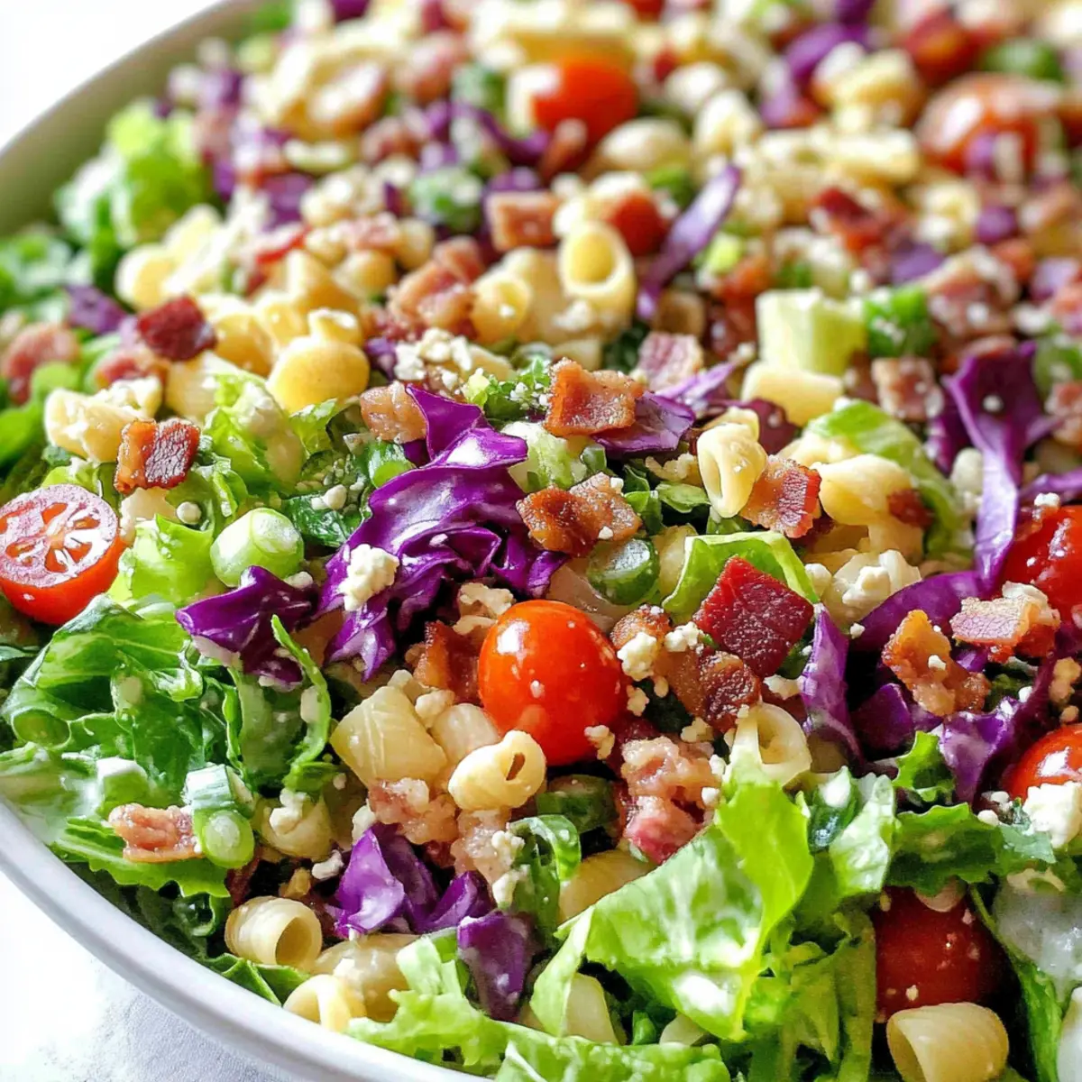 When making Portillo’s Chopped Salad, consider your guests’ dietary restrictions. The recipe contains cheese and bacon, which some individuals may be allergic to. You can easily make it dairy-free by omitting the gorgonzola or using vegan cheese. For those sensitive to gluten, ensure that the pasta chosen is gluten-free.