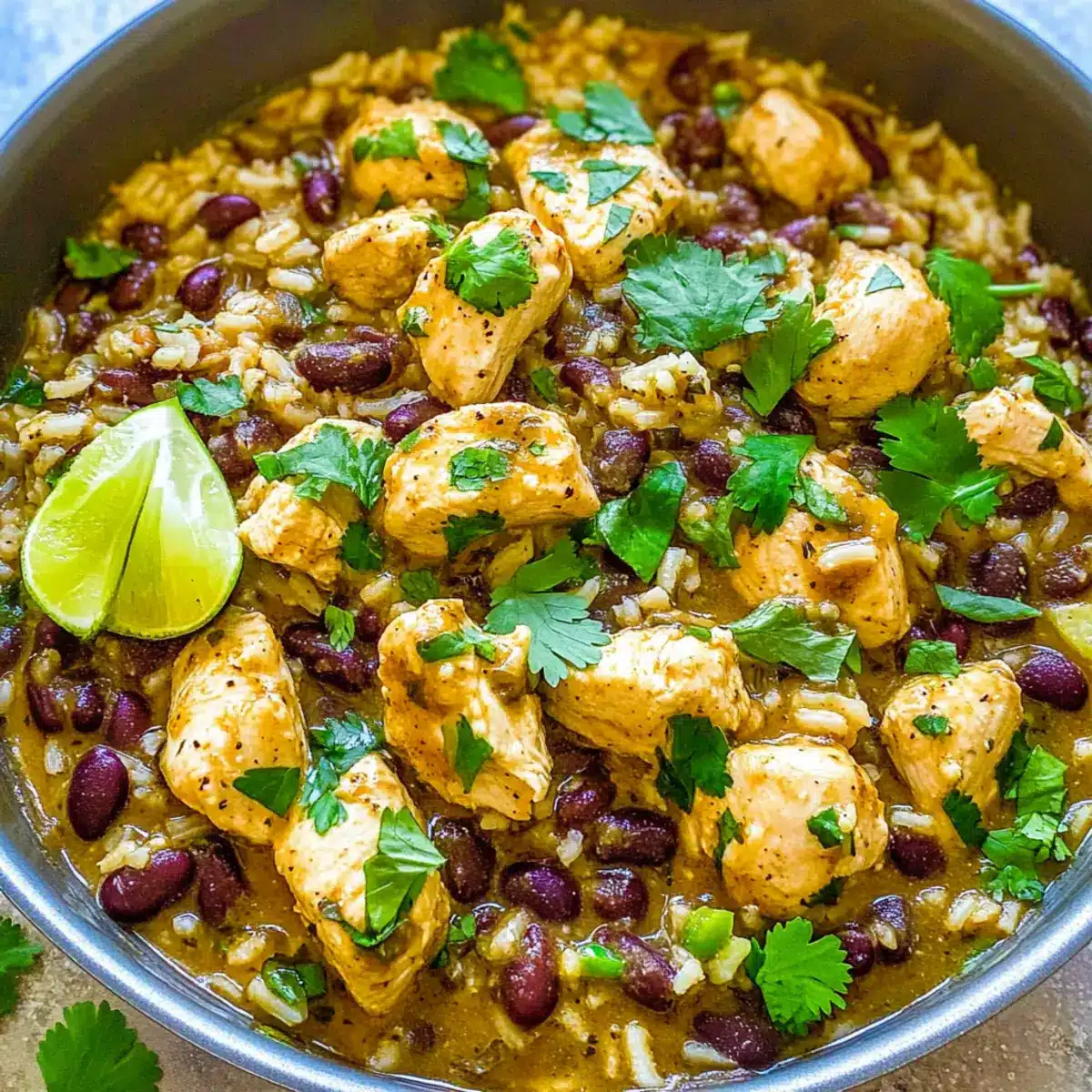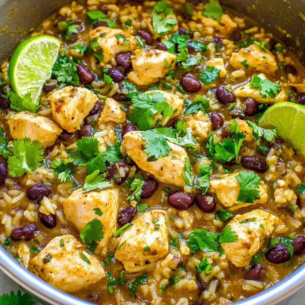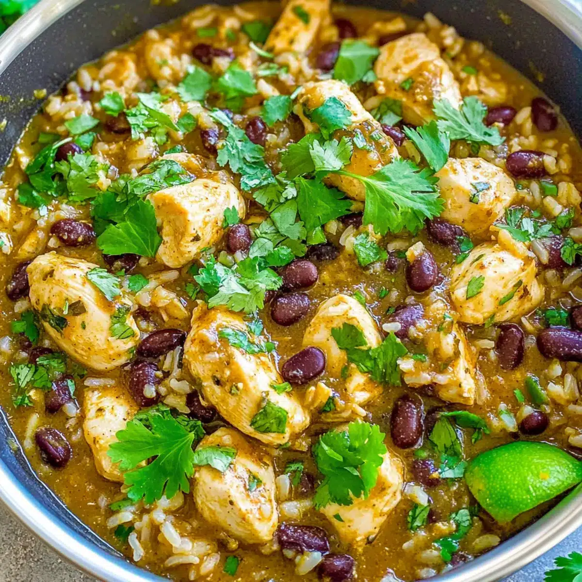 Finally, remove the skillet from the heat and drizzle in 2 tablespoons of lime juice. Toss in the freshly chopped cilantro and season with salt and pepper to taste. This finishing touch enhances the freshness of your dish, making the vibrant flavors pop in your exquisite Salsa Verde Chicken, Rice, and Beans.