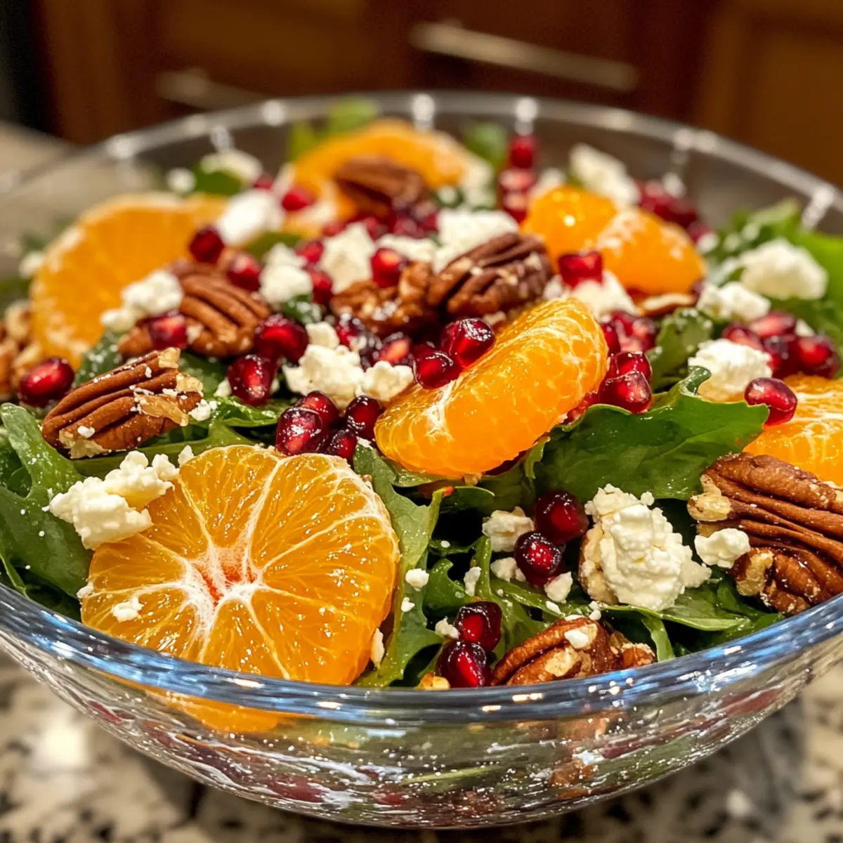 - In a large salad bowl, combine approximately 4 cups of mixed spring greens, making sure they are clean and crisp. Add the juicy segments of 2 fresh oranges, halved for easy access, along with 1 cup of vibrant pomegranate seeds. Finally, sprinkle in ½ cup of crumbled feta cheese.