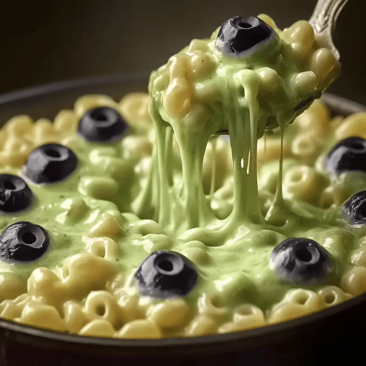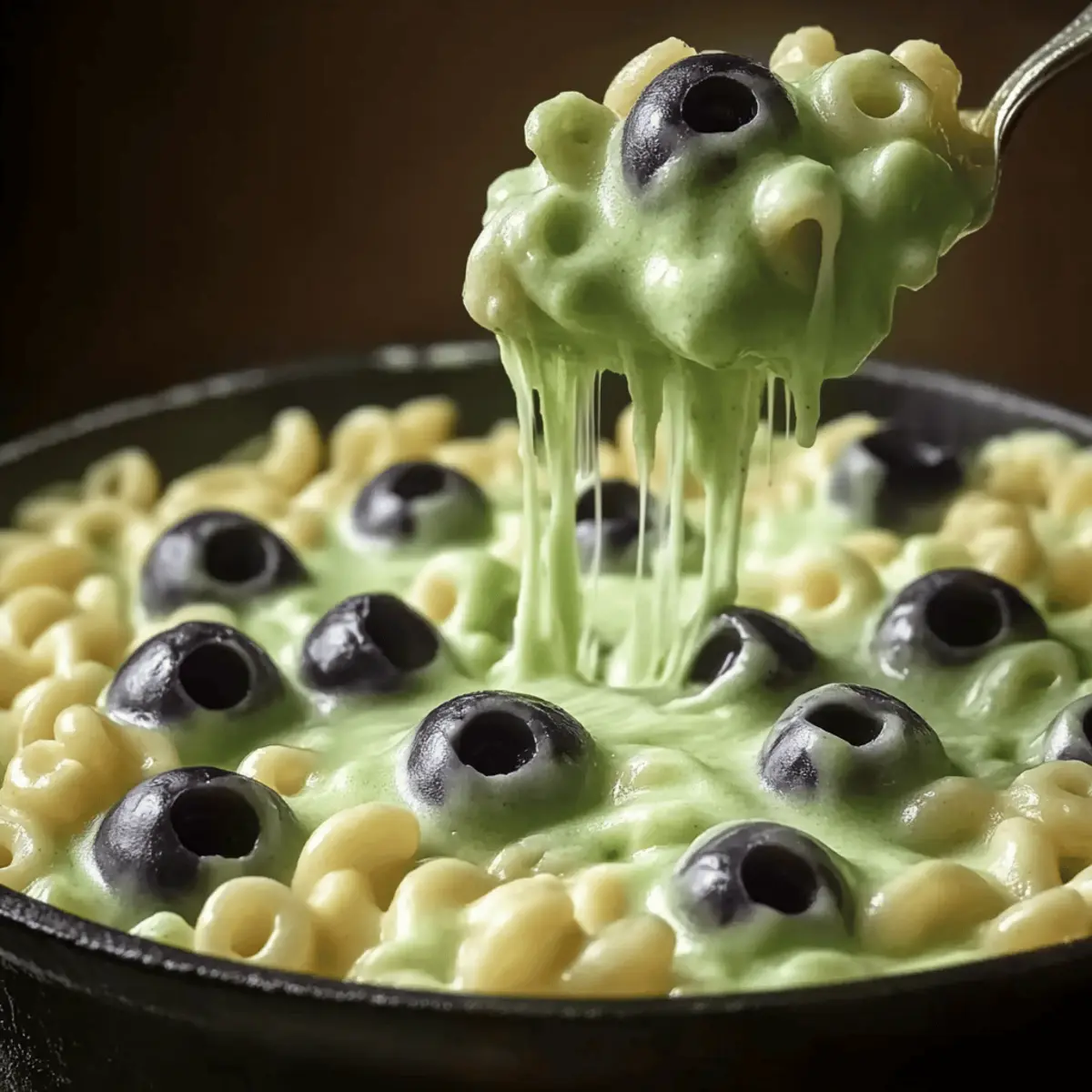 Before serving, create your spooky eyeballs by pressing a black olive slice into each mozzarella ball. Place these on top of your baked Witch’s Cauldron Mac and Cheese. This whimsical decoration not only enhances the festive theme but also adds a fun interactive element to your delicious dish!